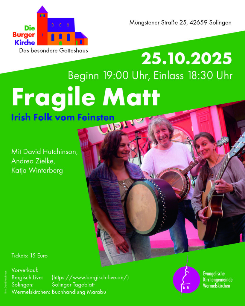 Am Samstag, den 25.10.2025, wird es „irisch“ in der Burger Kirche. Fragile Matt sind dann wieder zu Gast und spielen flotte irische und auch schottische Musik. Neben Bandgründer David Hutchinson (Gesang, irische Bouzouki), dessen Stimme nach bestem irischem Whiskey klingt, stehen Andrea Zielke (Gesang, Gitarre) und Katja Winterberg (Bodhrán, Geige) auf der Bühne.