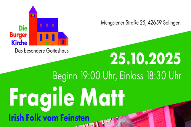 Am Samstag, den 25.10.2025, wird es „irisch“ in der Burger Kirche. Fragile Matt sind dann wieder zu Gast und spielen flotte irische und auch schottische Musik. Neben Bandgründer David Hutchinson (Gesang, irische Bouzouki), dessen Stimme nach bestem irischem Whiskey klingt, stehen Andrea Zielke (Gesang, Gitarre) und Katja Winterberg (Bodhrán, Geige) auf der Bühne.