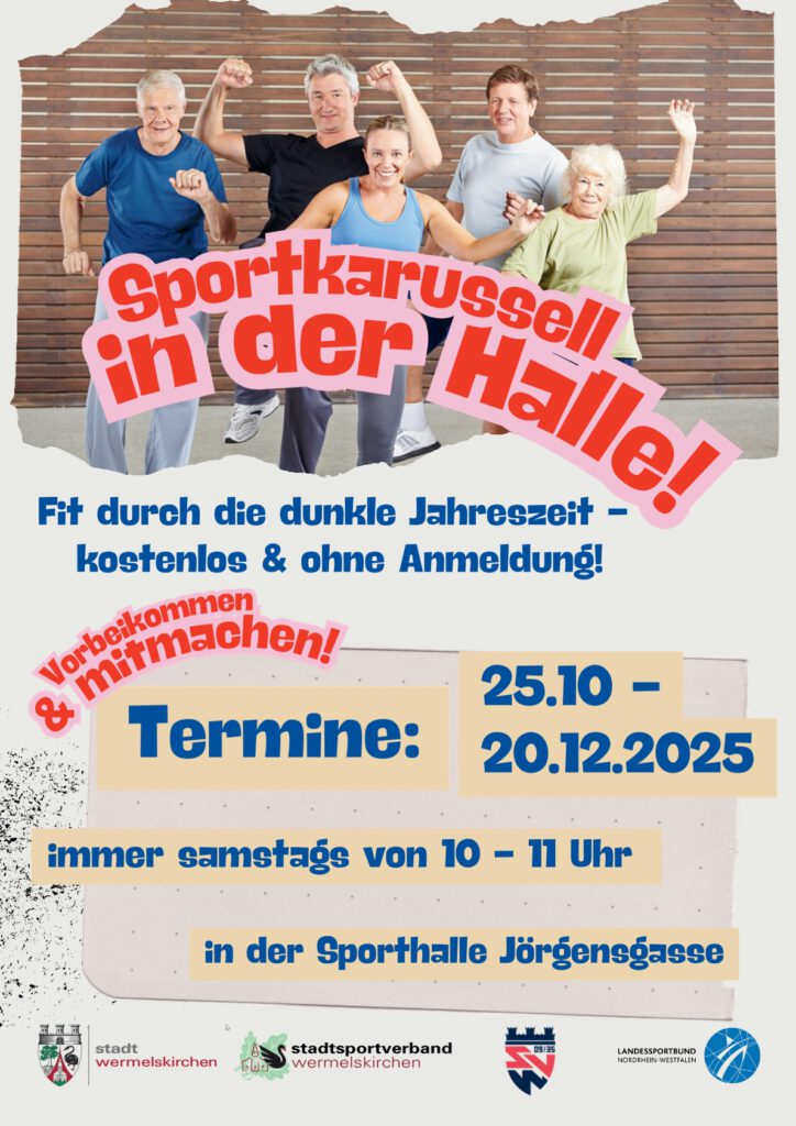 Ab Sams­tag, 25. Okto­ber, wird jeden Sams­tag bis zum 20. Dezem­ber von 10 bis 11 Uhr in der Sport­hal­le Jör­gens­gas­se trai­niert. Das Ange­bot ist kos­ten­los, kann ohne Anmel­dung genutzt wer­den und ist eine Koope­ra­ti­on der Stadt Wer­mels­kir­chen mit dem Stadt­sport­ver­band, dem SV 09/35 Wer­mels­kir­chen e.V. und dem Lan­des­sport­bund.