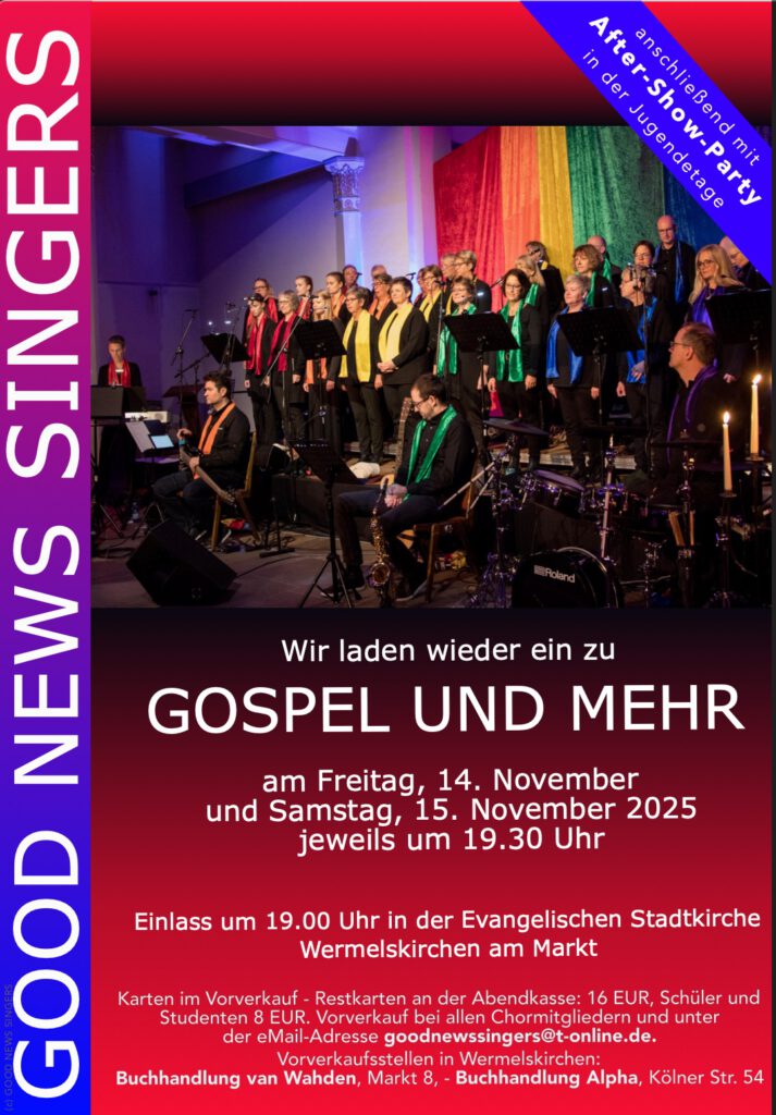 Am Freitag, 14.11. und Samstag, 15.11.2025 lädt der Gospelchor “Good News Singers” zu zwei Gospelkonzerten in die Ev. Stadtkirche Wermelskirchen ein.