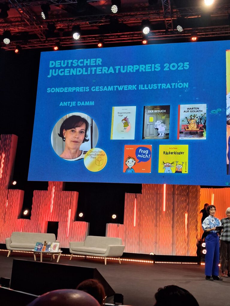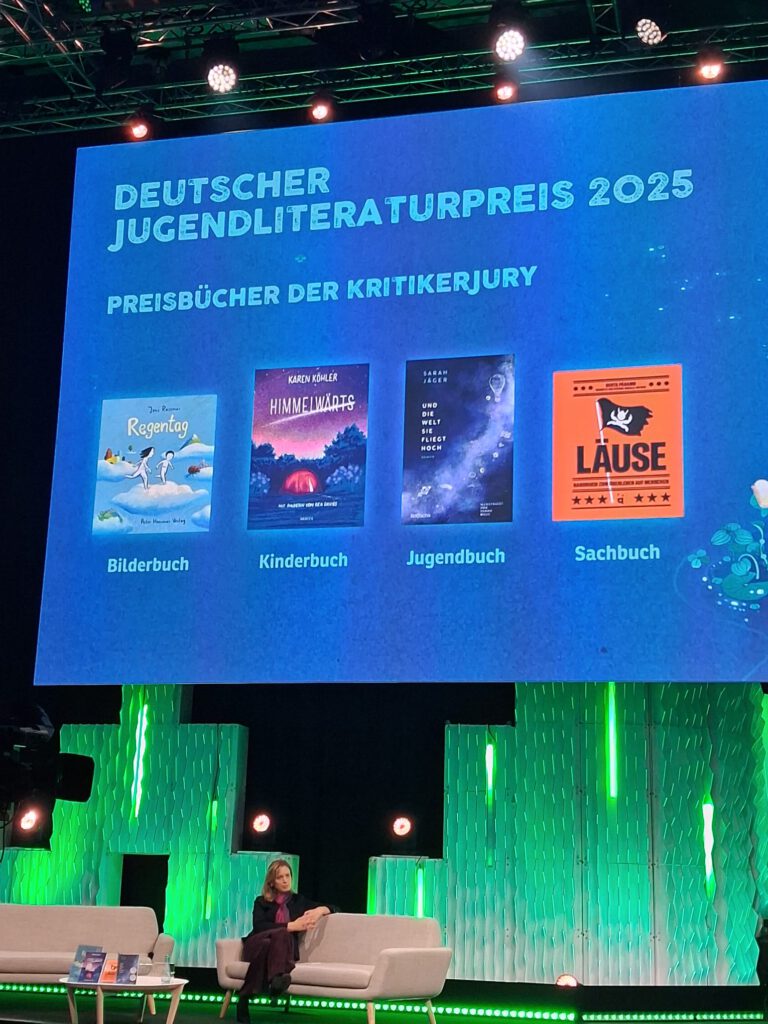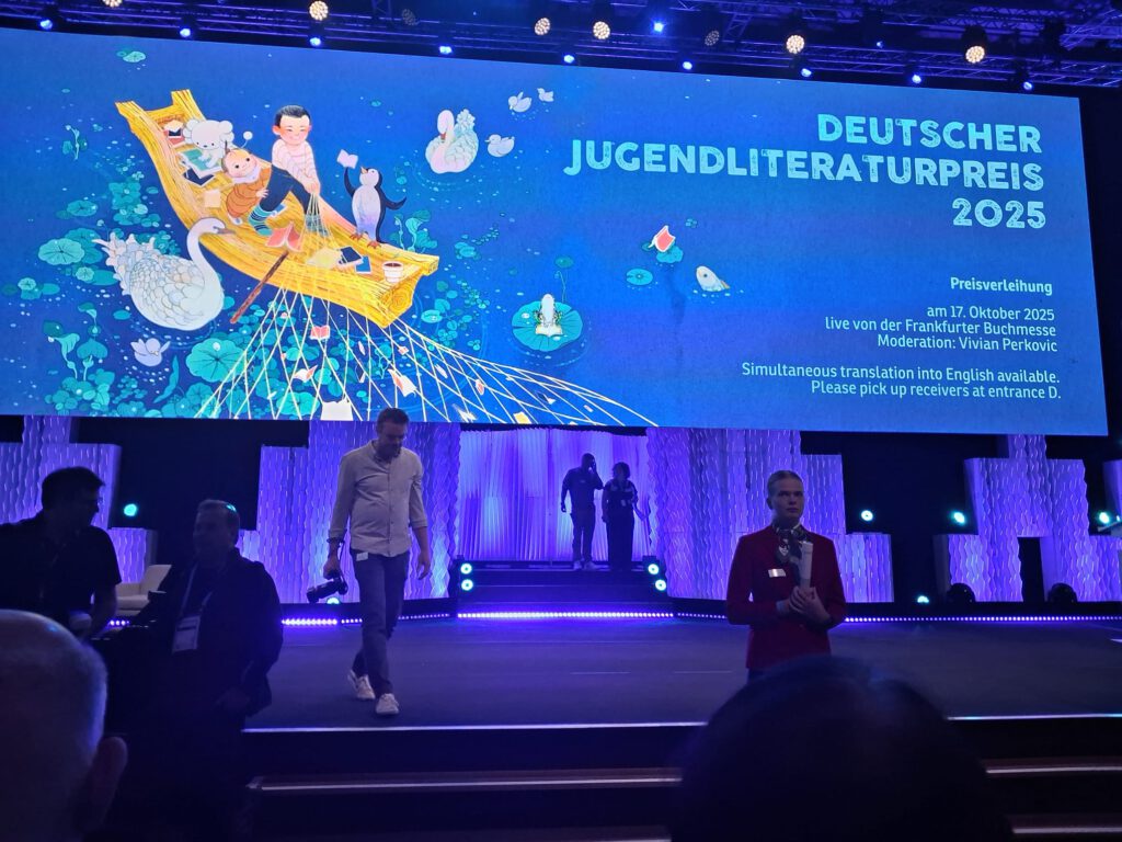 Am Freitag, 17. Oktober, wurde um 17:30 Uhr im Congress-Center im Saal Harmonie der Messe Frankfurt der Deutsche Jugendliteraturpreis 2025 vergeben. Mit 1600 Gästen war das die größte Einzelveranstaltung der Buchmesse. Vier Bücher aus den Sparten Bilder‑, Kinder‑, Jugend- und Sachbuch gingen als Sieger hervor. Dazu vergab die Jugendjury mit einem Titel ihren eigenen Preis. Die Sonderpreise „Illustration Neue Talente“ und „Illustration Gesamtwerk“ wurden ebenfalls vergeben. Die drei ehrenamtlich arbeitenden Jurys haben ein unglaubliches Lesepensum bewältigt. Aus ca. 630 eingereichten Titeln der deutschsprachigen Kinder- und Jugendliteratur filterten sie die besten Bücher heraus. Beeindruckende Titel, literarisch hochwertig und mit einer großen inhaltlichen Bandbreite suchen jetzt ihre Leserinnen und Leser. Der Arbeitskreis für Jugendliteratur sagt, das sind „Bücher, die Mut machen. Sie stehen für die Kraft der Sprache, die Neugier des Denkens und die Lust, sich eine eigene Meinung zu bilden.“