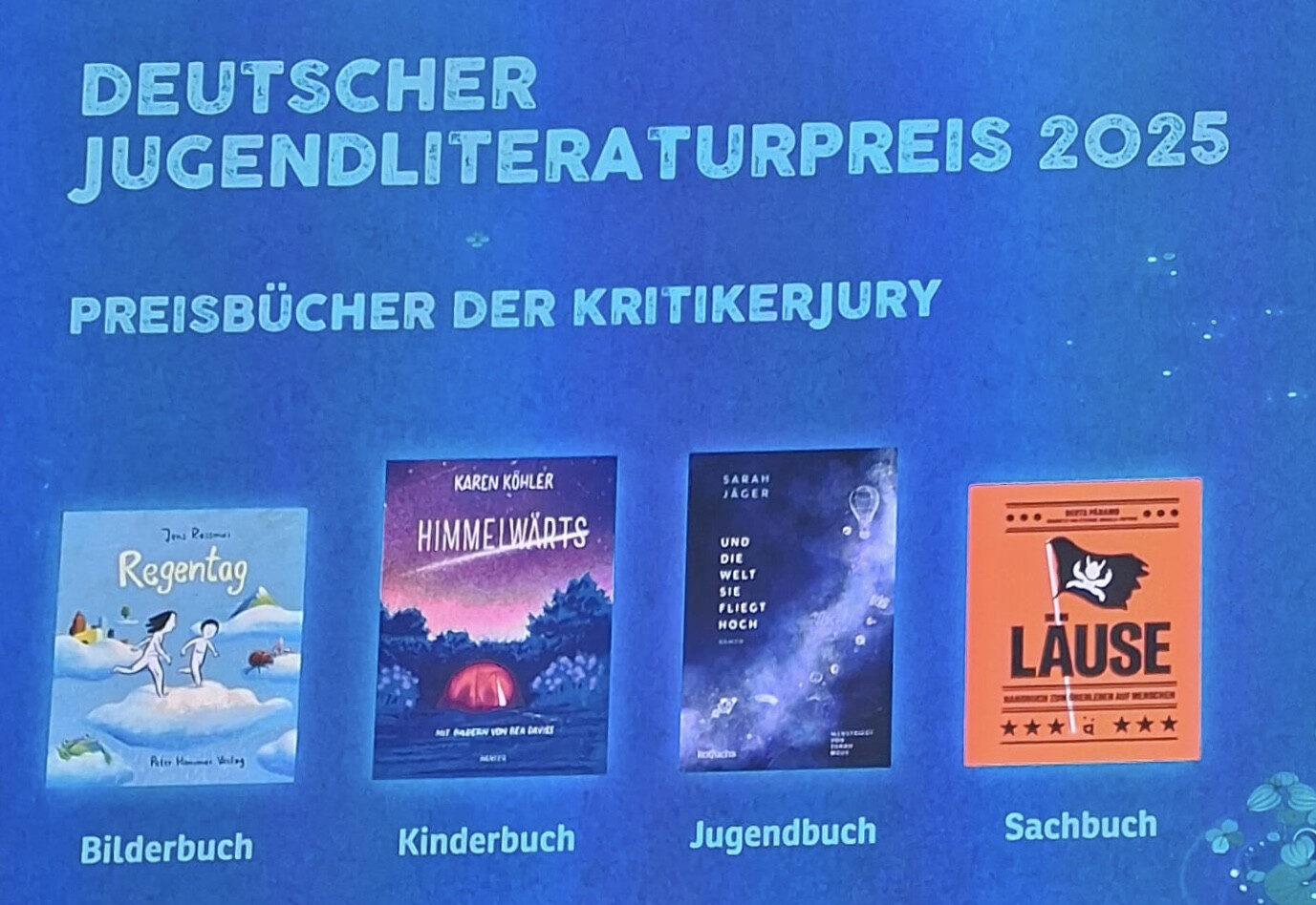 Am Freitag, 17. Oktober, wurde um 17:30 Uhr im Congress-Center im Saal Harmonie der Messe Frankfurt der Deutsche Jugendliteraturpreis 2025 vergeben. Mit 1600 Gästen war das die größte Einzelveranstaltung der Buchmesse. Vier Bücher aus den Sparten Bilder‑, Kinder‑, Jugend- und Sachbuch gingen als Sieger hervor. Dazu vergab die Jugendjury mit einem Titel ihren eigenen Preis. Die Sonderpreise „Illustration Neue Talente“ und „Illustration Gesamtwerk“ wurden ebenfalls vergeben. Die drei ehrenamtlich arbeitenden Jurys haben ein unglaubliches Lesepensum bewältigt. Aus ca. 630 eingereichten Titeln der deutschsprachigen Kinder- und Jugendliteratur filterten sie die besten Bücher heraus. Beeindruckende Titel, literarisch hochwertig und mit einer großen inhaltlichen Bandbreite suchen jetzt ihre Leserinnen und Leser. Der Arbeitskreis für Jugendliteratur sagt, das sind „Bücher, die Mut machen. Sie stehen für die Kraft der Sprache, die Neugier des Denkens und die Lust, sich eine eigene Meinung zu bilden.“