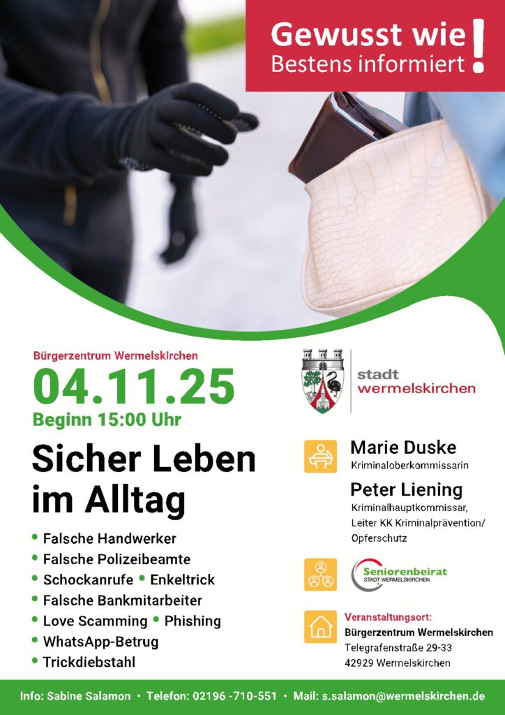 Die beiden Experten der Kriminalpolizei informieren in ihrem Vortrag über aktuelle Betrugs- und Diebstahlsmaschen, mit denen Kriminelle immer wieder versuchen, insbesondere ältere Menschen zu täuschen und um ihr Erspartes zu bringen. Zu den Themen gehören neben Trickdiebstahl, Phishing oder WhatsApp-Betrug unter anderem auch: