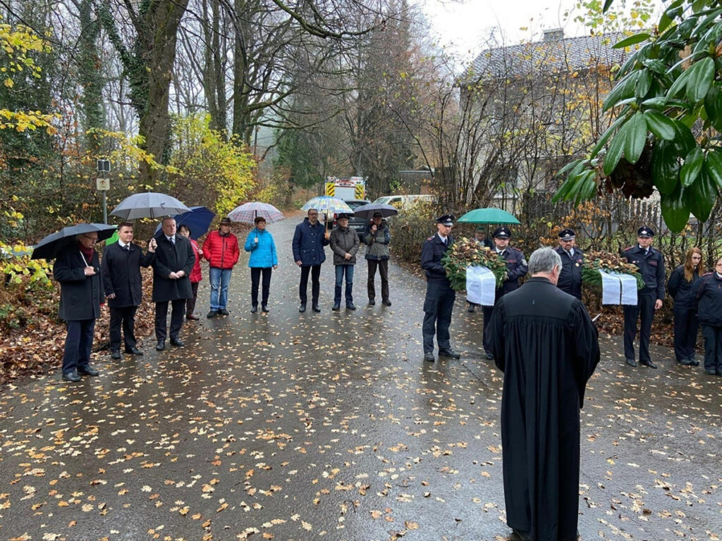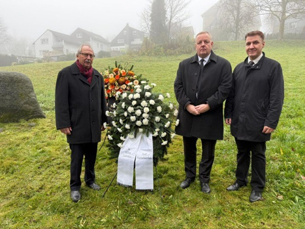 Vor dem Geden­ken am Mahn­mal im Hüpp­tal waren Bür­ger­meis­ter Bernd Hibst sowie sei­ne bei­den Stell­ver­tre­ter Ste­fan Leßenich und Nor­bert Galons­ka bereits beim Geden­ken an den Volks­trau­er­tag der Evan­ge­li­schen Kir­chen­ge­mein­de und der Frei­wil­li­gen Feu­er­wehr am Mahn­mal in Wel­ler­busch.
