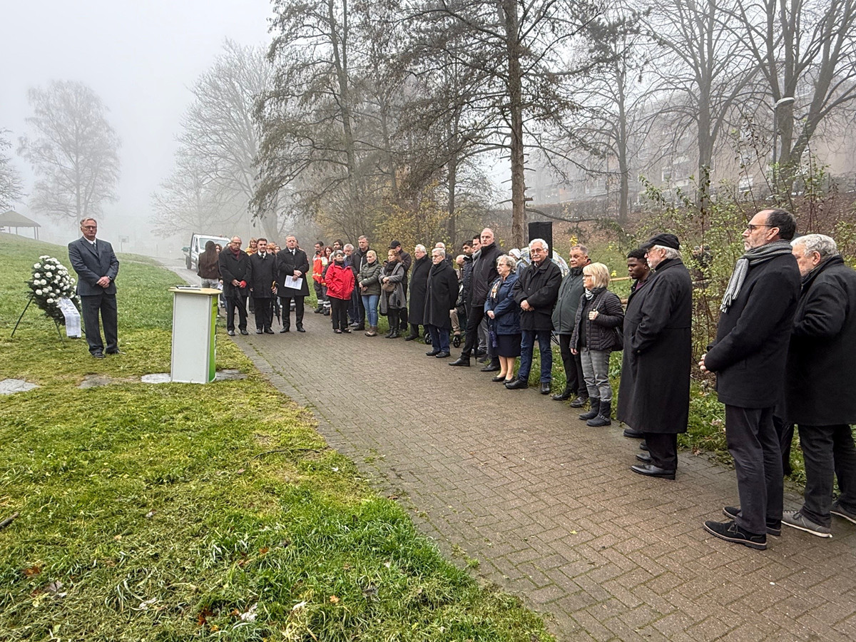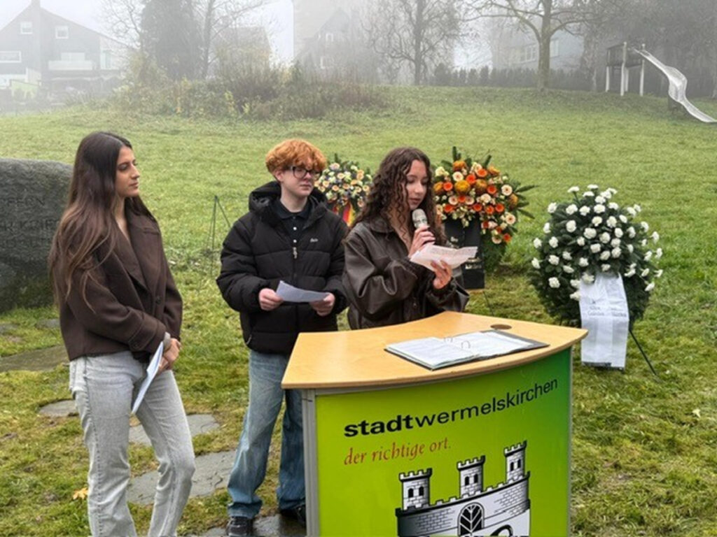Es war eine ein­dring­li­che Gedenk­fei­er zum heu­ti­gen Volks­trau­er­tag am Mahn­mal im Hüpp­tal. Und auch ein Zei­chen, dass der Volks­trau­er­tag, der ursprüng­lich vor über 100 Jah­ren durch den Volks­bund Deut­sche Kriegs­grä­ber­für­sor­ge ein­ge­führt wur­de, auch heu­te noch aktu­ell ist: „Wir ste­hen heu­te hier, um an all jene Men­schen zu erin­nern, die in Krie­gen und durch Gewalt ihr Leben ver­lo­ren haben. Die­se Momen­te des Inne­hal­tens sind wich­tig, denn hin­ter jeder Zahl, die wir in Geschichts­bü­chern lesen, steckt ein Mensch mit einem Leben, Träu­men und Hoff­nun­gen, die zu früh ende­ten“, sag­ten Emma Jalowietz­ki, Talya Elif Sari­ka­ya und Leo­nel Maren­holz von der AG Erin­nern des städ­ti­schen Gym­na­si­ums. Sie berich­te­ten von ihrer Exkur­si­on nach Ausch­witz und den beklem­men­den Ein­drü­cken, die sie dort sam­mel­ten.