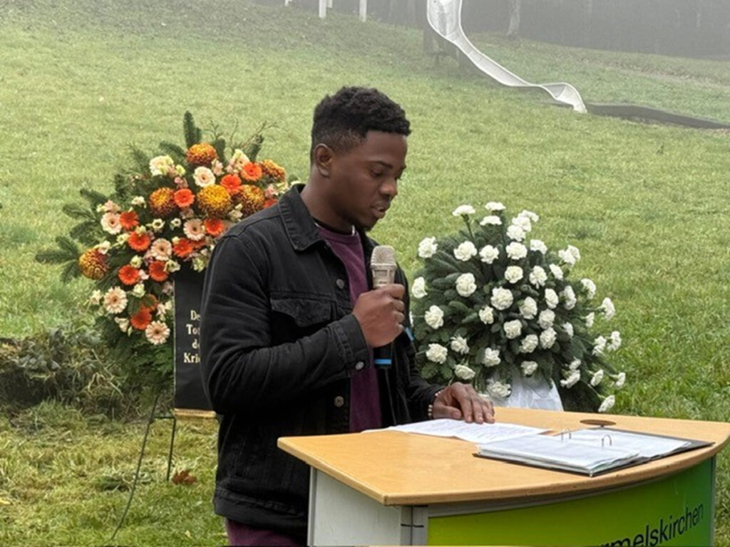 Ähn­lich for­mu­lier­te es auch Oumar Dial­lo aus Gui­nea, der als Flücht­ling nach Deutsch­land kam und in Wer­mels­kir­chen gera­de sei­ne zwei­te Aus­bil­dung absol­viert: „Wir alle tra­gen Ver­ant­wor­tung. Ganz gleich, woher wir kom­men oder wel­che Spra­che wir spre­chen. Wir alle wün­schen uns Sicher­heit, Gerech­tig­keit und Mensch­lich­keit. Frie­den bedeu­tet mehr als nur die Abwe­sen­heit von Krieg. Frie­den kön­nen wir nur errei­chen, indem wir auf­ein­an­der ach­ten, mit­ein­an­der reden und Unter­schie­de akzep­tie­ren. Ich glau­be, es beginnt mit klei­nen Din­gen wie Respekt, Mit­ge­fühl und mit der Bereit­schaft, ein­an­der zuzu­hö­ren.“