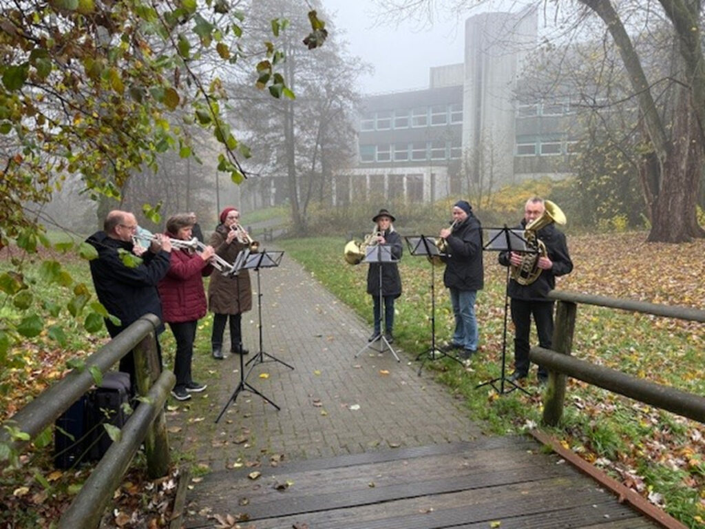 Musi­ka­lisch umrahmt wur­de die Gedenk­fei­er im Hüpp­tal vom Posau­nen­chor der Evan­ge­li­schen Kir­chen­ge­mein­de.