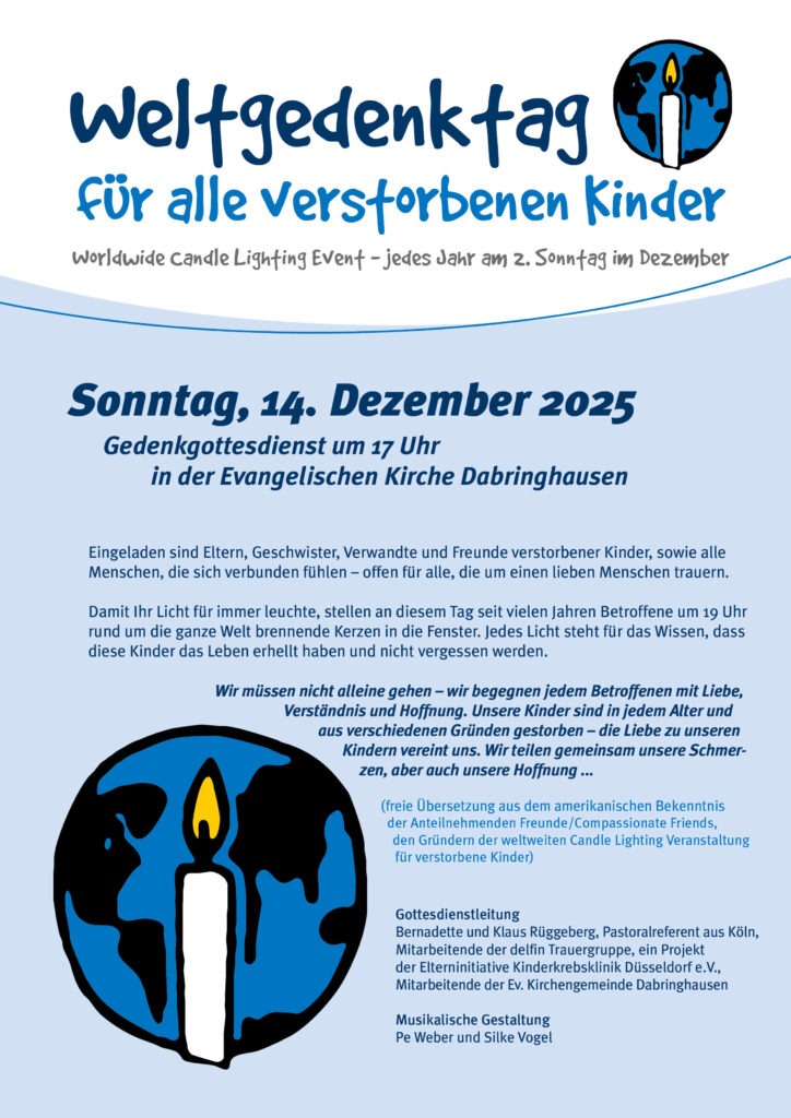 Herzliche Einladung zum Gedenkgottesdienst am 14. Dezember und 17 Uhr in der Evangelischen Kirche in Dabringhausen.