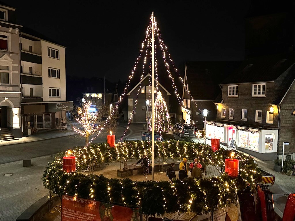 heute Abend, ab 18.30 Uhr, leuchtet der Adventskranz nun – schwebend – in voller Pracht.