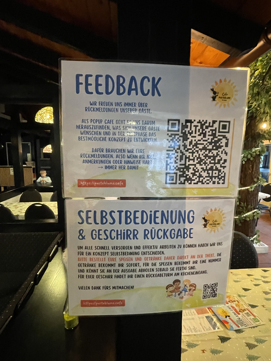 Besonders wichtig ist dem Team: Feedback! Über QR-Codes und ein Online-Formular können Besucher jederzeit Wünsche äußern. Das Café versteht sich als “Versuchslabor”: