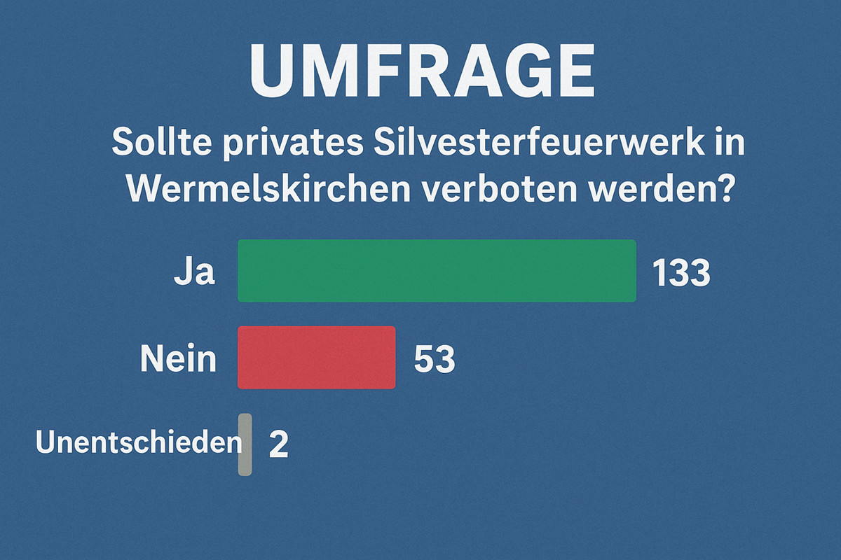 Uns ist bewusst, dass an der Umfrage auch Menschen außerhalb Wermelskirchens teilgenommen haben. Die Abstimmung lief über einen Zeitraum von drei Tagen und wurde über soziale Medien verbreitet. Dennoch zeigt das Ergebnis eine klare Tendenz: Die Mehrheit der Teilnehmenden spricht sich gegen privates Feuerwerken aus.