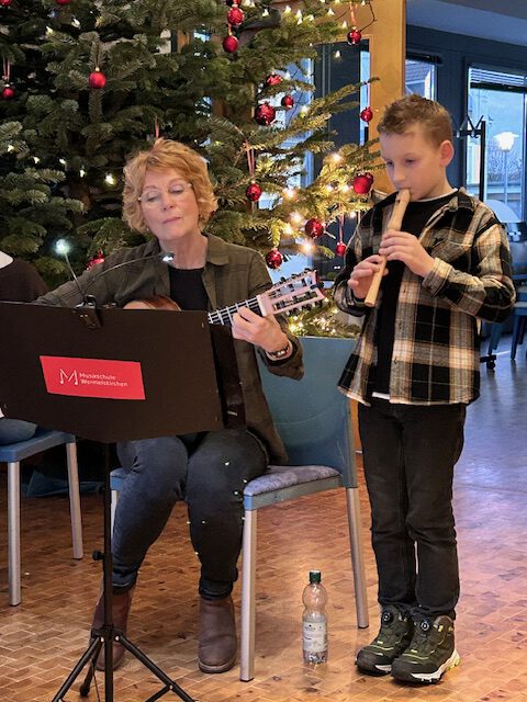 Unter der Leitung der Musikschullehrerin Andrea Dahlhaus boten die jungen Musikerinnen und Musiker im Alter von 7 bis 14 Jahren ein kurzweiliges, 45-minütiges Programm dar. Nach der Einleitung mit dem Stück Milonga, einem Gitarrenspiel von Jorge Cardosa, spielte der Jüngste, Kilian, zwei Weihnachtslieder auf der Blockflöte.