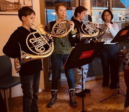 Ihm folgte eine Bläsergruppe, 2 Posaunen mit Tenorhorn, mit Interpretationen bekannter Weihnachtslieder wie Jingle Bells. Mit dem wunderschönen warmen Klang von 4 Waldhörnern, einstudiert und begleitet von Musikschullehrerin Sachiyo Krük, begeisterte ein weiteres Ensemble die Senioren mit weihnachtlichen Melodien.