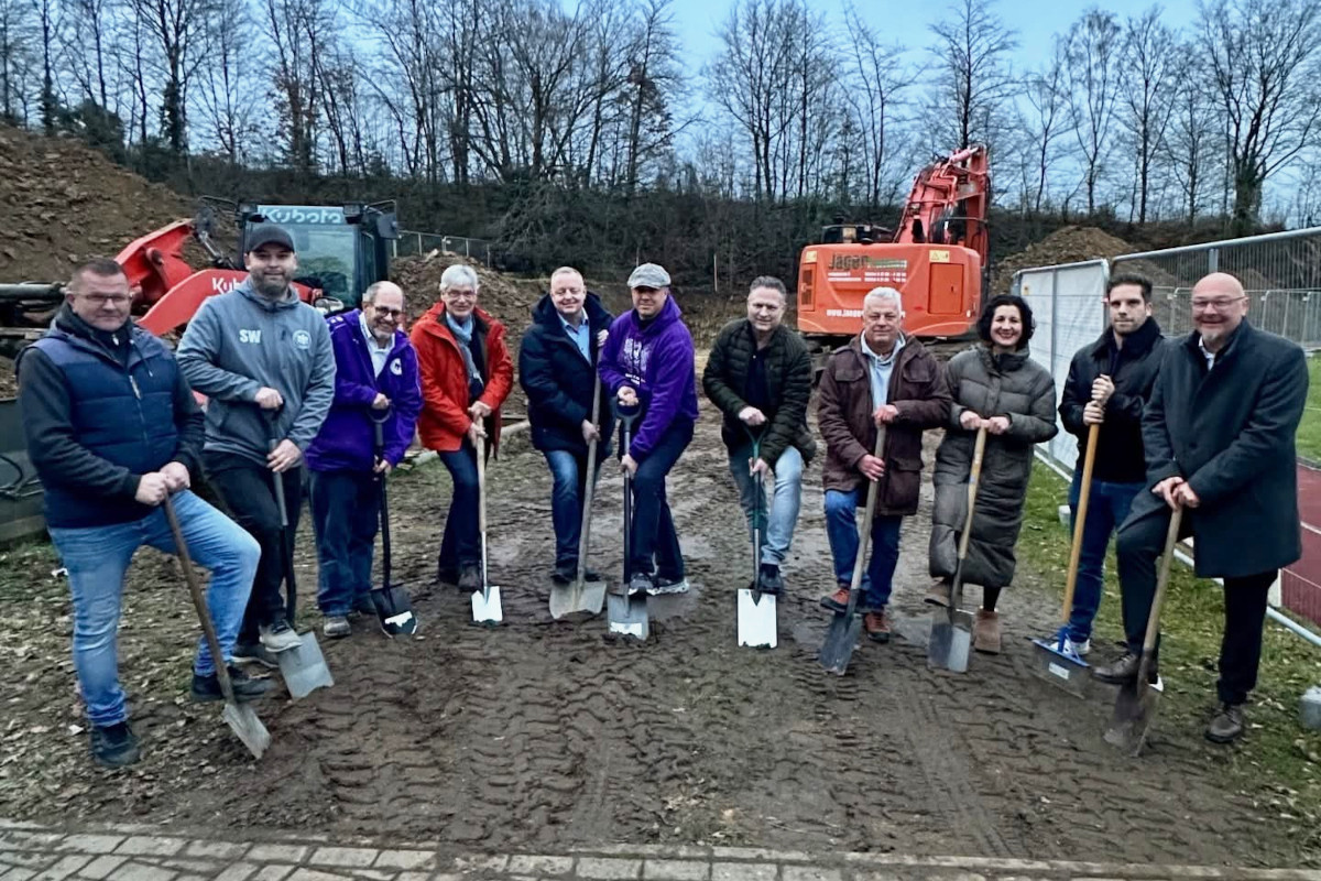 Frühzeitige Bescherung beim Dabringhauser Turnverein (DTV). Für den Sportverein geht ein lang ersehnter Wunsch in Erfüllung: Der Bau des neuen Vereinsheims im Straußenfarm-Höferhof-Stadion ist gestartet. Den offiziellen ersten Spatenstich machten Bürgermeister Bernd Hibst, der DTV-Vorsitzende Christoph „Calli“ Leyhausen, Vorstandsmitglieder sowie die Abteilungsleiterinnen und Abteilungsleiter des Vereins.