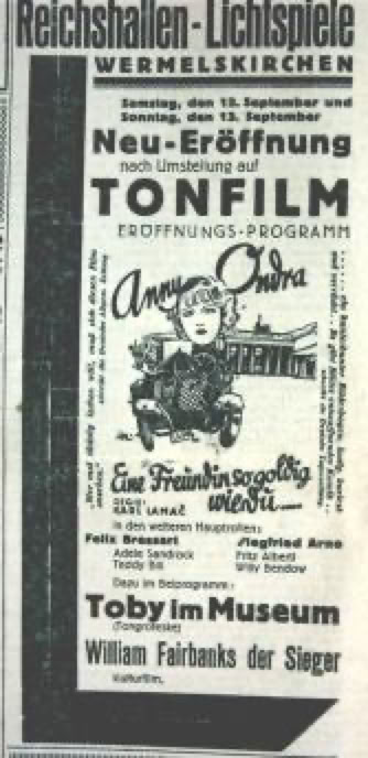 1931 wurde aus dem Staunen ein echtes Ereignis: Der Tonfilm kam nach Wermelskirchen. Die Zeitung schrieb begeistert darüber, und viele von uns erinnern sich an die Erzählungen: Man hörte Stimmen, Musik, Geräusche – alles kam plötzlich aus der Leinwand. Der erste Tonfilm hieß „Eine Freundin so goldig wie Du“, und man sagte: Jetzt ist Wermelskirchen ganz vorne dabei.