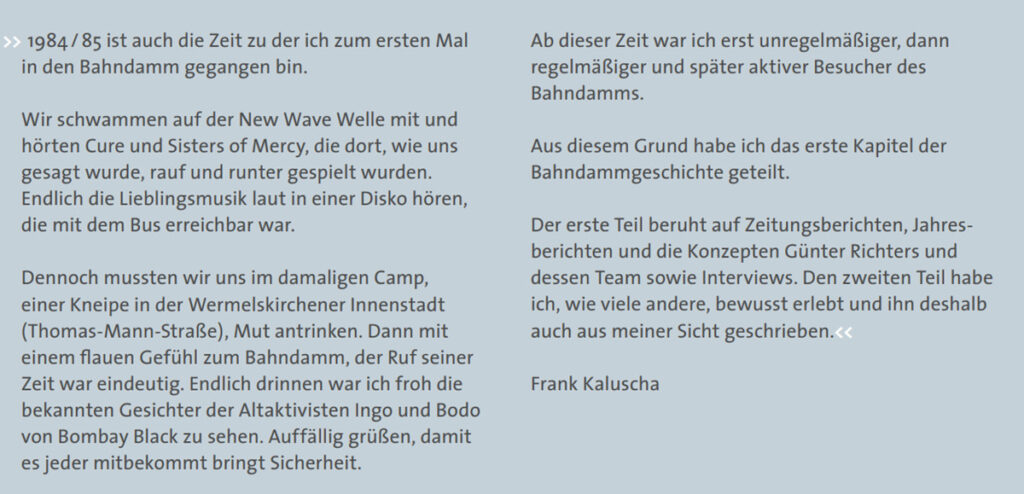 Mit die­ser Ent­wick­lung wuchs auch das Selbst­be­wusst­sein der Akti­ven. Der Bahn­damm war kein Rand­phä­no­men mehr, son­dern Teil einer über­re­gio­na­len Sub­kul­tur. Bands tour­ten, Kon­tak­te ent­stan­den, Freund­schaf­ten über Stadt­gren­zen hin­weg wur­den geknüpft. Für vie­le Besu­che­rin­nen und Besu­cher wur­de der Ort zu einem sozia­len Zen­trum – nicht nur am Wochen­en­de, son­dern als fes­ter Bezugs­punkt ihres All­tags.