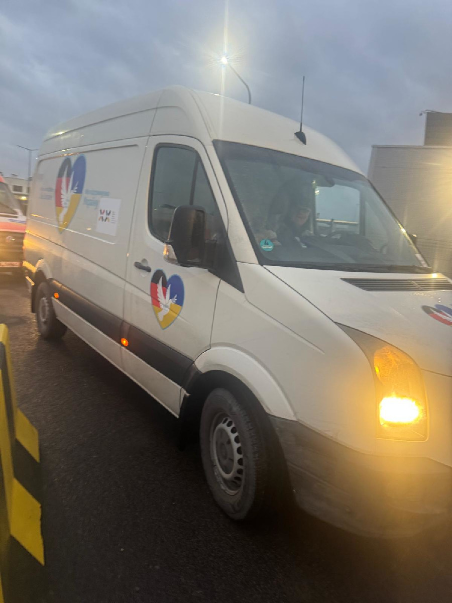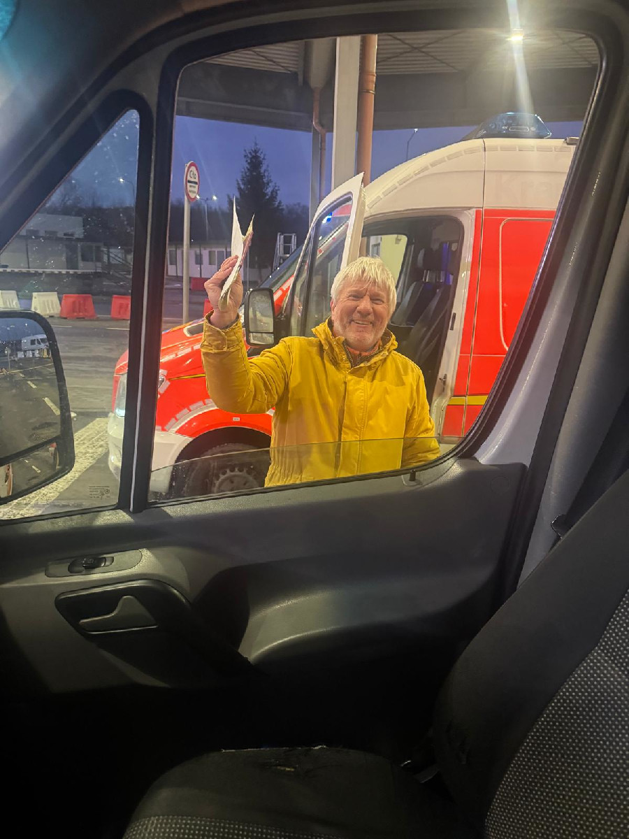 Bald ist es geschafft. Es wird emo­tio­nal. Die ukrai­ni­schen Abho­ler erwar­ten uns bereits. Hei­ßer Tee wird gereicht. Die Über­ga­be folgt einem erprob­ten Ritu­al: Jeder Fah­rer erklärt „sein“ Fahr­zeug, gibt Hin­wei­se zur Tech­nik. Dann Umar­mun­gen – im Namen all jener, die gehol­fen haben – und schließ­lich die Schlüs­sel­über­ga­be.
