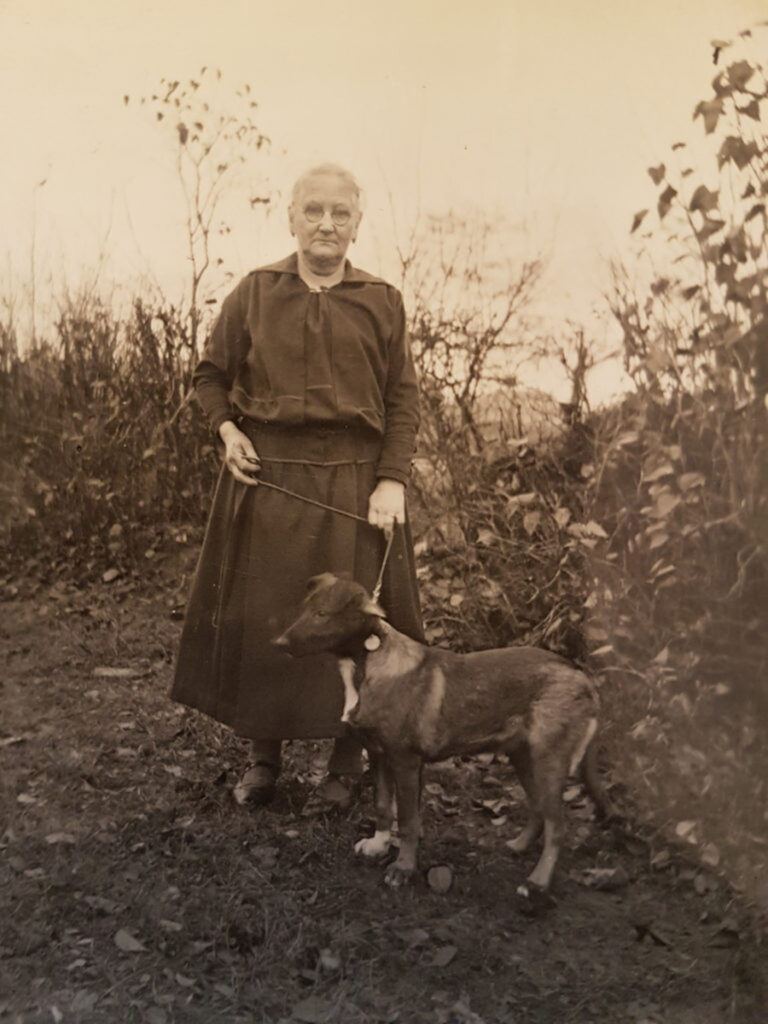 Dann ein Gruppenfoto mit Hund, ganz links Hildegard, daneben ihre Mutter Emma, die ich, dank der WhatsApp-Hilfe von Frau Ulli (die Dame mit dem Koffer), sowohl in jung als auch in alt identifizieren kann.