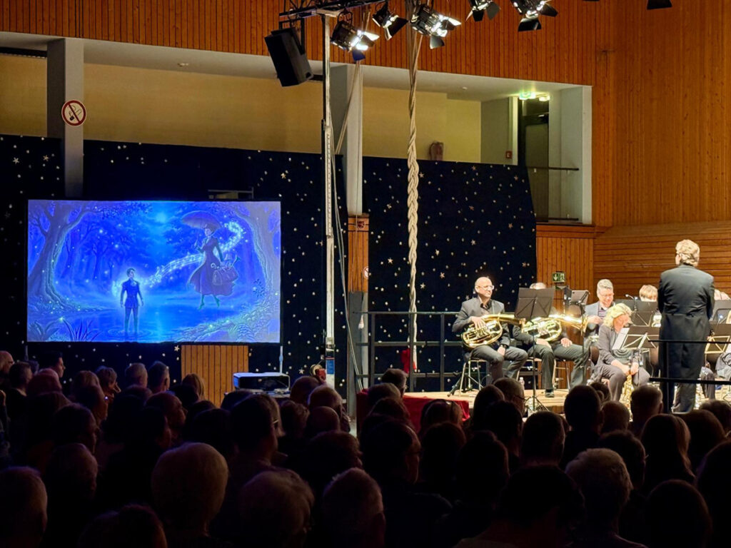 Gleich zu Beginn ent­führt der ver­wun­sche­ne Teich des Frosch­kö­nigs in eine melan­cho­lisch-zau­ber­haf­te Welt. Der Sma­ragd­spie­gel, Hei­mat eines ver­zau­ber­ten Prin­zen, erwacht musi­ka­lisch zum Leben. Unter der Lei­tung von Peter Wut­t­ke ent­fal­tet das Orches­ter eine Klang­welt, die berührt und trägt. Es fol­gen mär­chen­haf­te Sta­tio­nen: Mary Pop­pins, der Nuss­kna­cker, Gan­dalf, Peer Gynt und Rapun­zel – jedes Kapi­tel ein eige­nes Klang­bild, atmo­sphä­risch unter­stützt von einer lie­be­voll gestal­te­ten Power­Point vol­ler mär­chen­haf­ter Bil­der.