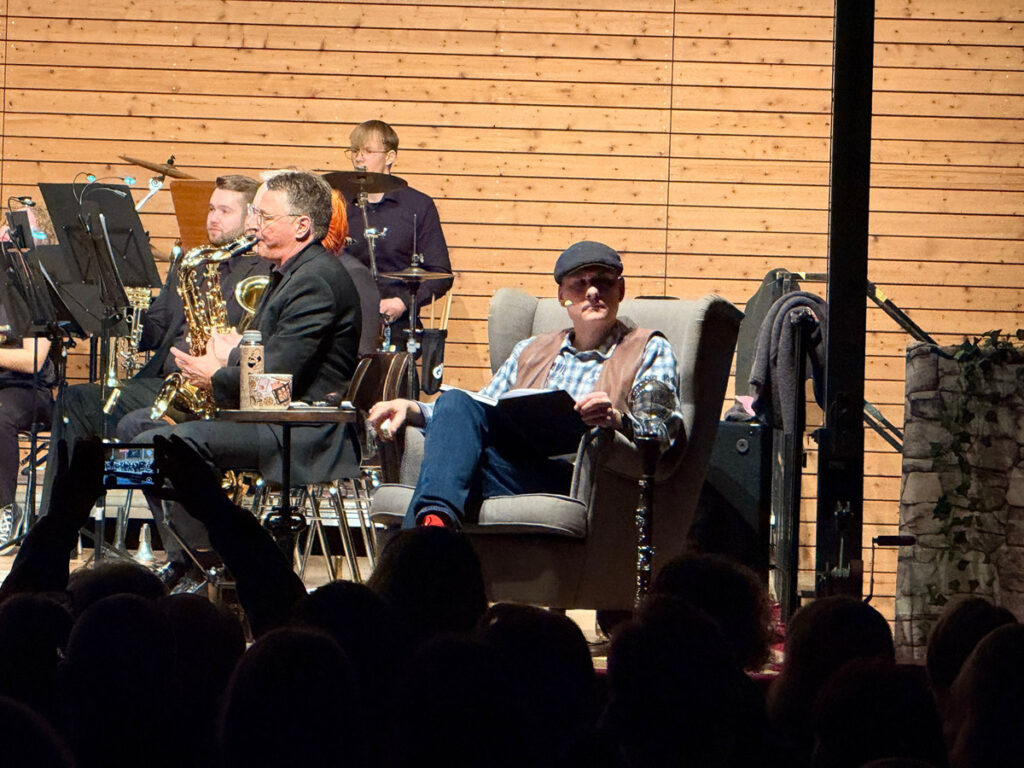 Punkt 18 Uhr beginnt die Rei­se. Unter herz­li­chem Applaus zieht das Blas­or­ches­ter Dabring­hau­sen ein. Mode­ra­tor Oli­ver Groß, stil­echt im Ohren­ses­sel, öff­net mit ruhi­ger, fes­seln­der Stim­me die Tür zu einem magi­schen Dabring­hau­sen. Er lädt das Publi­kum ein, nicht nur zuzu­hö­ren, son­dern Mit­rei­sen­de zu wer­den. Die Mär­chen – vir­tu­os erzählt – ver­bin­den die Musik­stü­cke zu einer zusam­men­hän­gen­den Geschich­te und bil­den den roten Faden durch den gesam­ten Abend.