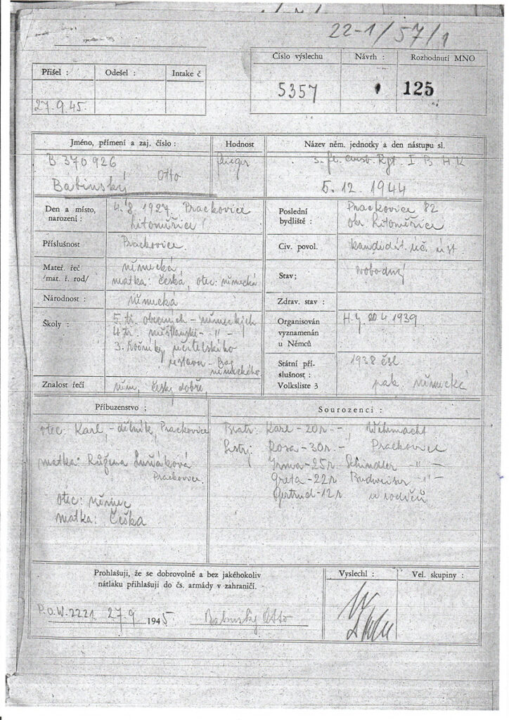 Bei dem beigefügten Anhang aus dem Militärarchiv handelt es sich um ein Verhörprotokoll vom 27. September 1945. Otto wurde tatsächlich noch Anfang Dezember 1944 zum militärischen Dienst eingezogen und war Soldat in Ausbildung. „Flieger“ steht da auf Deutsch und 1. Beobachtung Ausbildung und Horchkompanie. (1BHK)