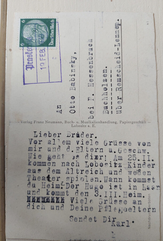 Otto Babinsky schien für eine kurze Zeit, und zwar von Januar bis Februar 1939, im Haus meiner Ur-Großeltern gewohnt zu haben. Höchstwahrscheinlich war er im Zuge der Kinderlandverschickung bei meiner Familie untergebracht worden.