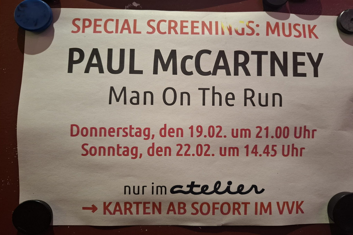 Nur am 19. Febru­ar wur­de in aus­ge­wähl­ten Kinos der Film “Man on the run” gezeigt. Die­ser Film über Paul McCart­ney und sei­ne Band “Wings” wur­de um 21 Uhr in Düs­sel­dorf gezeigt.
