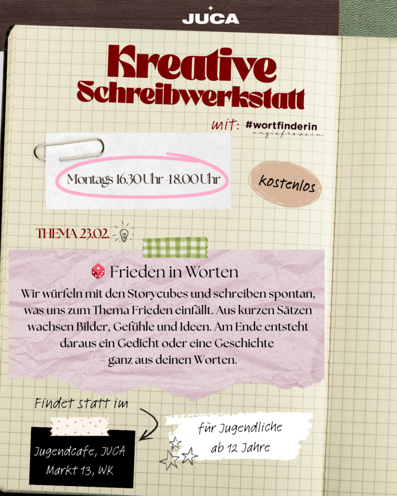Montags trifft man sich im JUCA und findet gemeinsam Worte, Geschichten und Gedichte. Alle ab 12 Jahre und alle, die gerne schreiben.