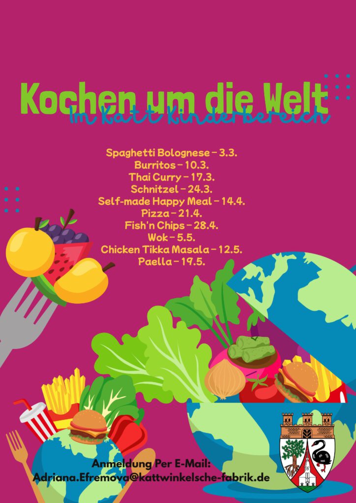 „Kochen um die Welt“: Ganz Zei­chen inter­na­tio­na­ler Gerich­te ste­hen die zehn Ter­mi­ne „Kochen um die Welt“ ab dem kom­men­den Diens­tag, 3. März. Bis zum 19. Mai kochen die teil­neh­men­den Kin­der immer diens­tags von 15 bis 17 Uhr typi­sches Essen aus unter­schied­li­chen Län­dern: Spa­ghet­ti Bolo­gne­se, Thai Cur­ry, Pael­la oder auch Schnit­zel ste­hen auf dem Spei­se­plan.