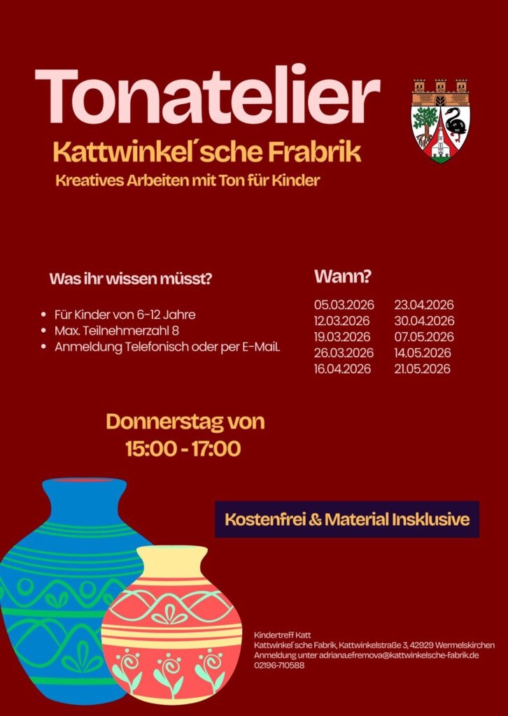 Anmel­dun­gen nimmt der Kin­der- und Jugend­be­reich der Kat­twin­kel­schen Fabrik per Mal an adriana.efremova@kattwinkelsche-fabrik.de oder per Tele­fon unter 02196 / 710588 ent­ge­gen.