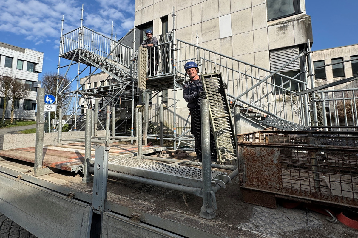 Es geht endlich weiter: Die Fluchttreppe am Rathaus-Nebengebäude ist abgebaut und neue Gerüste sind bereits geplant. Genauer gesagt: sogenannte Treppentürme. Deren Aufbau läutet die letzten Arbeitsschritte zur endgültigen Fertigstellung der Rathaus-Fassade ein.