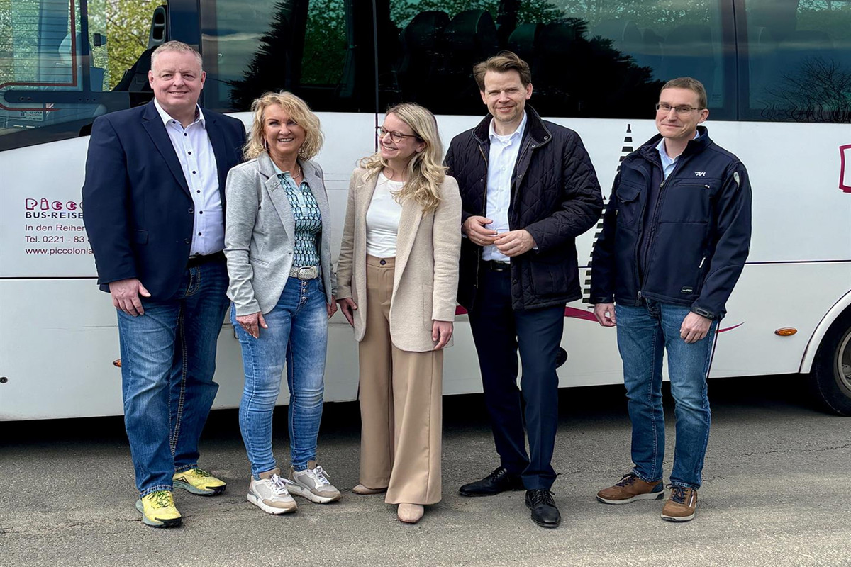 Den Start­schuss in die neue Sai­son des Ber­gi­schen Wan­der­Bus­ses gaben Land­rat Arne von Boet­ti­cher, Oden­thals Bür­ger­meis­te­rin Lau­ra Lund­berg, Bür­ger­meis­ter Bernd Hibst aus Wer­mels­kir­chen, Gabi Wil­helm, Geschäfts­füh­re­rin der Tou­ris­mus­or­ga­ni­sa­ti­on das Ber­gi­sche, und RVK-Geschäfts­füh­rer Dr. Mar­cel Frank. Der Ber­gi­sche Wan­der­Bus bringt Wan­der­be­geis­ter­te auch in die­sem Jahr wie­der kom­for­ta­bel zu den schöns­ten Rou­ten im Ber­gi­schen Land und ist damit das Tor zu Eif­gen und Dhünn. Mit Beginn der Sai­son am kom­men­den Sams­tag, den 28. März, star­tet das bewähr­te Ange­bot in eine neue Run­de und ver­bin­det attrak­ti­ve Wan­der­zie­le zwi­schen Ber­gisch Glad­bach, Oden­thal und Wer­mels­kir­chen.