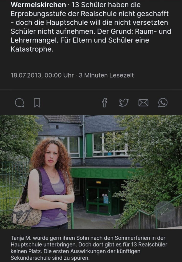 Ein wei­te­rer Moment, der mich tief geprägt und poli­ti­siert hat, war der Ein­satz mei­ner Mut­ter. In mei­ner letz­ten Fol­ge habe ich erzählt, dass ich die Erpro­bungs­stu­fe der Real­schu­le nicht geschafft habe und danach auf die Haupt­schu­le wech­seln muss­te. Die­ser Weg war nicht ein­fach. Die Haupt­schu­le Wer­mels­kir­chen konn­te mich zunächst nicht auf­neh­men, weil es kei­ne frei­en Plät­ze gab. Es stand sogar im Raum, dass ich nach Rem­scheid oder Bur­scheid wech­seln müss­te. Für mei­ne Fami­lie und mich als Dell­män­sche Bub kam das aber nicht infra­ge. Mei­ne Mut­ter hat sich damals nicht damit abge­fun­den. Sie hat die Bezirks­re­gie­rung Köln ein­ge­schal­tet und auch die Medi­en infor­miert.