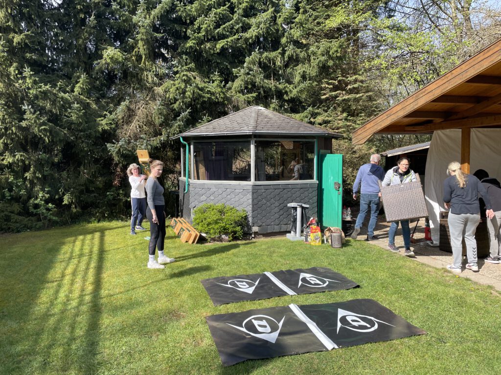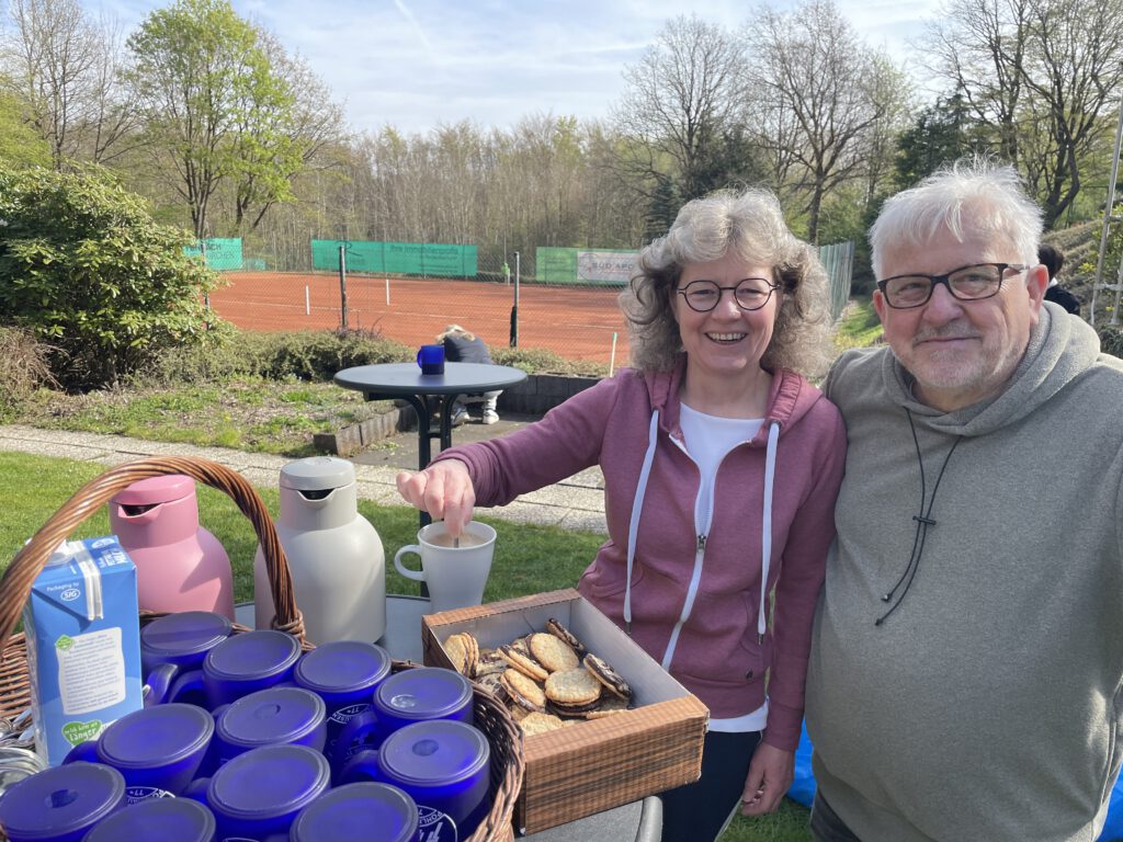 Wie unsere Fotos beweisen, gingen auch die in der letzten Saison erfolgreichen Herren- und Damen-Tenniscracks mit gutem Beispiel voran. Die gesamte Grünanlage, die Sitzmöbel, die Zuschauerterrassen usw. wurden auf Vordermann gebracht. Selbstverständlich wurde auch für das leiblichte Wohl der Helferinnen und Helfer gesorgt. Angela Platt, die Festausschussvorsitzende des Vereins und der langjährige 2. Vorsitzende Michael Diel sorgten nicht nur für Kaffee und sonstige Leckereien für eine gute Arbeitsatmosphäre.