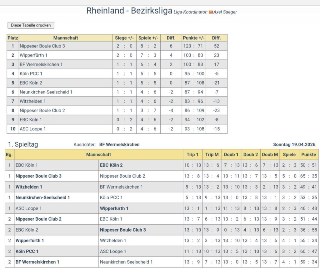 Und noch schwieriger wird es, wenn der Boden matschig und voller Pfützen ist wie am Sonntag Nachmittag auf dem Schwanenplatz. Nach rund sieben Stunden (!) Spielzeit standen die Gewinner und Verlierer des 1. Spieltags der Bezirksliga fest. Auffallend bei dem Ranking: Von den ersten fünf Mannschaften kommen fünf aus Köln. Die Boulefreunde Wermelskirchen liegen auf einem respektablen 3. Platz vor Köln PCC 1. Weitere der Spieltage folgen bis Oktober.