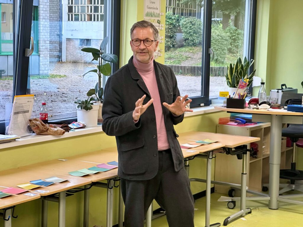 Far­ben schaf­fen nicht nur Atmo­sphä­re, son­dern kön­nen auch beru­hi­gend oder akti­vie­rend wir­ken. Des­halb hat­te sich die Stadt Wer­mels­kir­chen ein umfas­sen­des Farb­kon­zept für die Gesamt­schu­le gewünscht und für das Pro­jekt das Insti­tut für evi­denz­ba­sier­te Farb­psy­cho­lo­gie der Ber­gi­schen Uni­ver­si­tät Wup­per­tal gewin­nen kön­nen. Unter der Lei­tung von Pro­fes­sor Dr. Axel Bue­ther, Inha­ber des Lehr­stuhls für Didak­tik der visu­el­len Kom­mu­ni­ka­ti­on, fand nun der ers­te Work­shop zur Ent­wick­lung des wis­sen­schaft­lich fun­dier­ten Farb­kon­zep­tes an der Gesamt­schu­le statt. Mit dabei waren Schü­le­rin­nen und Schü­lern, Ver­tre­te­rin­nen und Ver­tre­ter der Eltern­schaft und des Leh­rer­kol­le­gi­ums, die Schul­lei­tung und Mit­glie­der des Gebäu­de­ma­nage­ments der Stadt­ver­wal­tung.