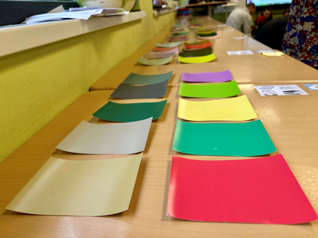 Ein Arbeits­schritt dabei: Aus einem Fun­dus von rund 1800 RAL-Farb­tö­nen wähl­ten drei- oder vier­köp­fi­ge Teams je fünf aus, die für sie „beson­ders schön“ oder auch „beson­ders häss­lich“ waren. Dabei wur­de bereits ein Unter­schied deut­lich: Die Teams der Schü­le­rin­nen und Schü­ler wähl­ten bei „beson­ders schön“ pas­tel­li­ge­re, pude­ri­ge Töne als die Erwach­se­nen-Teams.